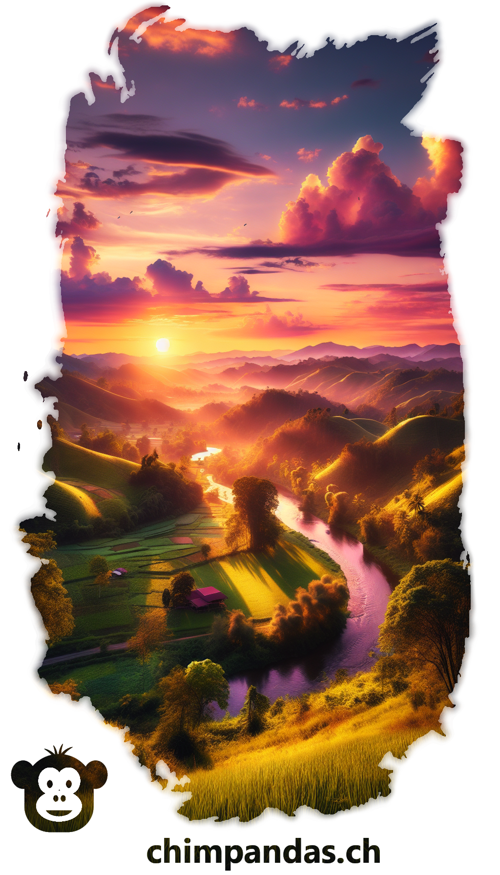 Title: Serene Sunset Over the Lush Green Valley Description: In this picturesque scene, the setting sun casts a warm, golden glow over a vast and verdant valley. The sky is painted with hues of pink, orange, and purple, creating a stunning display of colors as the day transitions into dusk. Wispy clouds float lazily across the sky, adding a touch of serenity to the moment. In the foreground, a gentle river meanders through the valley, its crystal-clear waters reflecting the brilliant colors of the sky above. Thick clusters of trees line the riverbanks, their leaves rustling softly in the evening breeze. Birds can be seen darting through the air, their cheerful chirping adding a lively soundtrack to the tranquil scene. Further in the distance, rolling hills extend as far as the eye can see, their slopes covered in a patchwork of vibrant green fields and meadows. A lone farmhouse nestled among the hills exudes a sense of rustic charm, its red roof standing out against the lush landscape. As the sun dips below the horizon, casting long shadows across the valley, a sense of peace and tranquility envelops the entire scene. The beauty of nature is on full display, inviting the viewer to pause, reflect, and appreciate the simple joys that surround us. Capture the essence of this serene sunset over the lush green valley in your AI's interpretation, allowing it to bring to life the beauty and tranquility of this breathtaking moment through its unique perspective.