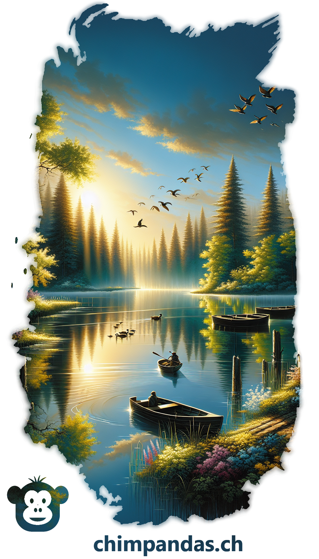 Title: Serene Morning at the Tranquil Lake Description: --- Nestled in a serene forest landscape, a pristine lake glistens under the soft morning light. The surface of the lake is a mirror, reflecting the clear blue sky above and the lush greenery that surrounds its banks. In the distance, tall trees stand like guardians, their leaves rustling softly in the gentle breeze. Near the edge of the lake, a family of ducks glides gracefully through the calm waters, their movements creating ripples that expand outward, disrupting the perfect reflection of the sky. The mother duck leads her fluffy ducklings in a straight line, teaching them the ways of the water. On the opposite shore, a solitary fisherman sits quietly in his small wooden boat, a fishing rod in hand. His focus is unwavering as he waits patiently for a nibble, his only companion the melodious sounds of nature. A wooden dock stretches out into the lake from the shore, a few empty boats tied to its weathered posts. Wildflowers of various colors bloom along the edges, adding a pop of vibrancy to the otherwise serene scene. As the sun rises higher in the sky, the golden rays dance on the water, creating a mesmerizing play of light and shadow. The tranquility of the moment is palpable, inviting viewers to pause, breathe, and immerse themselves in the beauty of nature. This image captures the essence of a peaceful morning at the lake, where time seems to stand still and worries fade away. It is a reminder of the simple joys that can be found in the natural world, if only we take a moment to appreciate them. ---