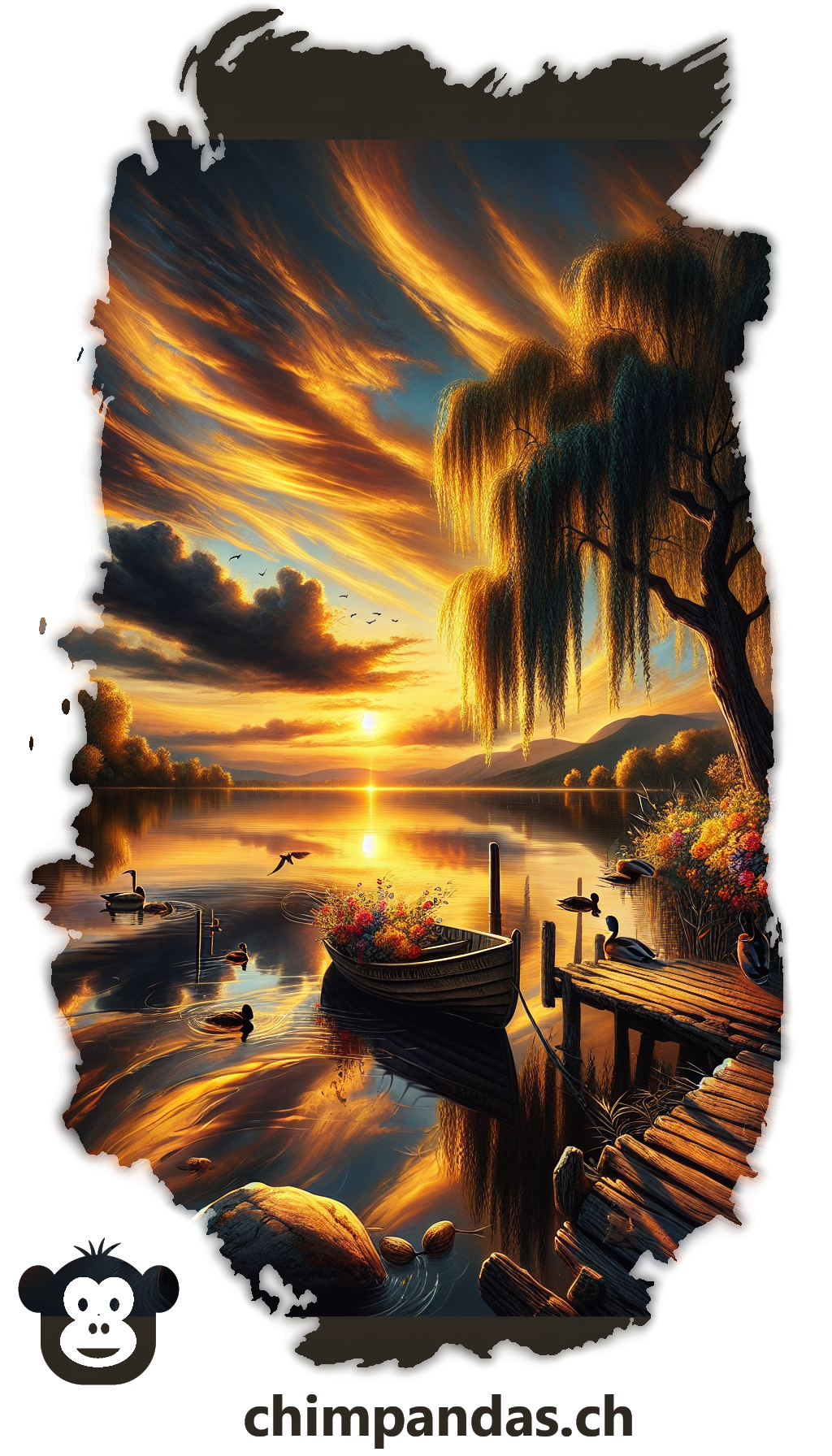 Title: Sunset Serenity Description: Imagine a tranquil scene at the edge of a vast, serene lake, under the captivating glow of a breathtaking sunset sky. The ethereal hues of gold, orange, and pink paint the sky in a mesmerizing display, casting a warm, soothing light over the landscape. Wispy clouds drift lazily across the sky, catching the last rays of the sun as it dips below the horizon. The water of the lake reflects the stunning colors above, creating a mirror-like surface that shimmers with a gentle, rippling motion. In the foreground, a small wooden rowboat bobs peacefully on the water, its oars resting quietly against its sides. The boat is adorned with a bouquet of vibrant wildflowers, adding a pop of color against the tranquil blues and purples of the evening. Nearby, a family of ducks glides gracefully across the water, leaving a trail of tiny ripples in their wake. On the shore, a weeping willow tree stretches its long, graceful branches towards the water, their delicate leaves rustling softly in the evening breeze. Next to the tree, a weathered wooden dock juts out into the lake, its planks worn smooth by the countless feet that have walked upon it over the years. As the sun continues its descent, the landscape is bathed in a warm, golden light, creating a magical atmosphere of peace and tranquility. The sounds of nature fill the air - the gentle lapping of the water, the distant call of a bird, the rustling of leaves in the wind. It is a perfect moment of harmony with the natural world, a fleeting glimpse of beauty and serenity that lingers in the heart long after the sun has disappeared below the horizon.