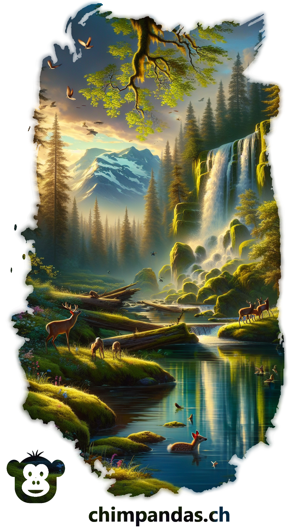 Image Description Prompt: The image is set in a serene and tranquil forest clearing, bathed in the soft glow of the morning sunlight filtering through the dense canopy above. In the center of the clearing, a majestic waterfall cascades down a series of moss-covered rocks, creating a gentle mist that surrounds the area. The clear waters of the waterfall tumble into a crystal-clear pool at the base, reflecting the vibrant greenery and colorful wildflowers that carpet the forest floor. Birds chirp merrily in the trees, their songs blending harmoniously with the soothing sound of the rushing water. A small family of deer cautiously emerges from the shadows of the trees, their soft brown fur glistening in the sunlight as they drink from the shimmering pool. Nearby, a playful squirrel scampers along a fallen log, its bushy tail twitching with excitement. In the distance, the towering peaks of a snow-capped mountain range rise majestically against the azure sky, their jagged outlines creating a breathtaking backdrop to the serene scene below. The air is filled with the earthy scent of damp moss and pine, adding to the overall sense of peace and tranquility that pervades the forest clearing. As you gaze upon this idyllic scene, you can't help but feel a deep sense of calm and wonder at the beauty of the natural world. The image captures a moment of perfect harmony between the elements, inviting you to pause, breathe, and immerse yourself in the timeless beauty of the forest.