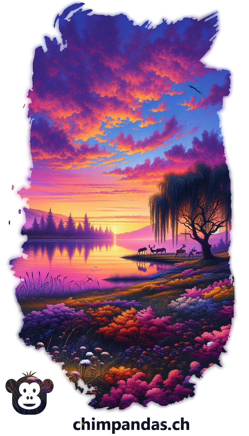 Title: Serenity at Sunset Description: Imagine a tranquil scene set against the backdrop of a breathtaking sunset. You find yourself standing at the edge of a pristine lake, its waters reflecting the warm hues of the setting sun. The sky above is painted in a gradient of soft pinks, oranges, and purples, creating a mesmerizing display of colors. Wisps of cotton candy clouds hover gently, adding to the sense of serenity in the air. In the foreground, a lush meadow stretches out, dotted with vibrant wildflowers swaying in the gentle breeze. The golden light of the sunset bathes the landscape in a warm, ethereal glow, casting long, soft shadows across the scene. A lone weeping willow tree stands tall at the water's edge, its drooping branches trailing delicately in the breeze. As you take in the beauty of the scene, you notice a family of deer emerging from the trees on the far side of the lake. They move gracefully, their silhouettes outlined against the colorful sky. A sense of peace washes over you as you witness this harmonious moment in nature, feeling connected to the beauty and tranquility that surrounds you. Capture this serene moment in an image and bring to life the peace and beauty of nature at twilight.