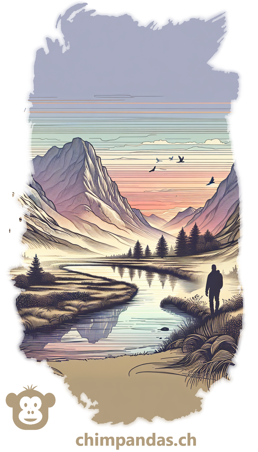 The image depicts a serene landscape at sunrise. The scene captures the quiet beauty of a mist-covered valley nestled between towering mountains. A gentle stream winds its way through the valley, reflecting the soft hues of the dawn sky. A lone figure, a hiker, stands at the edge of the stream, gazing out at the unfolding vista. The sky above is painted in shades of pink, purple, and gold as the sun begins to peek over the horizon, casting a warm glow over the landscape. The mountains loom majestically in the background, their peaks shrouded in mist. Birds can be seen flying overhead, their silhouettes etched against the colorful sky. The air is crisp and cool, carrying with it the scent of pine and fresh earth. The overall mood of the image is one of tranquility and awe-inspiring beauty, inviting the viewer to pause and appreciate the magnificence of nature.