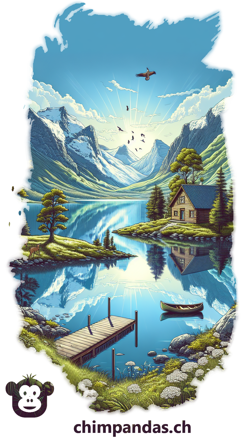 Title: Serene Mountain Lake Description: Imagine a picturesque scene of a serene mountain lake surrounded by lush green forests and towering, snow-capped peaks. The crystal-clear waters of the lake reflect the azure blue skies above, creating a mirror-like surface that shimmers in the sunlight. Nestled at the edge of the lake is a charming wooden cabin, its smokestack gently puffing out fragrant wisps of wood smoke. A small wooden dock extends into the water, where a lone canoe bobs gently in the gentle breeze. In the distance, a family of deer can be seen grazing peacefully on the grassy shore, their elegant silhouettes adding to the tranquility of the scene. Birds chirp melodiously in the trees, and the soft murmur of a nearby waterfall provides a soothing backdrop to the harmonious symphony of nature. As you take in this idyllic setting, you can feel all your worries and stresses melt away, replaced by a sense of peace and contentment. The beauty and serenity of this mountain lake are truly a sight to behold, a sanctuary for the soul in the midst of the majestic wilderness.
