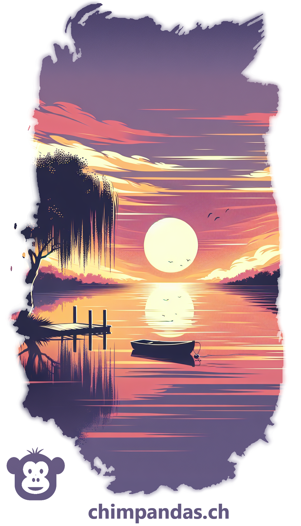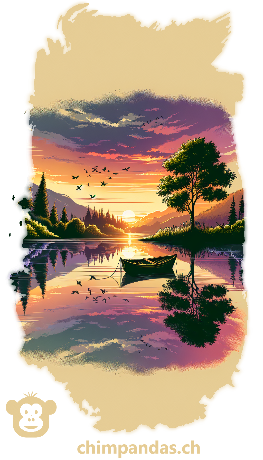 Title: Serene Sunset Reflections Description: Imagine standing on the edge of a tranquil lake at sunset, surrounded by a serene and picturesque landscape. The sun is dipping below the horizon, casting a warm, golden hue over the water and painting the sky in shades of orange, pink, and purple. The surface of the lake is perfectly still, mirroring the stunning display of colors above like a mirror. In the distance, lush green trees line the shore, their leaves gently swaying in the evening breeze. Birds are gracefully gliding across the sky, adding to the peaceful atmosphere. A small wooden boat is docked nearby, with its reflection visible in the calm waters. As the day transitions into night, the scene exudes a sense of tranquility and harmony. The beauty of nature in this moment is truly captivating, and it invites you to pause, breathe, and appreciate the simple and profound beauty of the world around you. Take a moment to immerse yourself in this serene sunset reflection, where time seems to stand still and worries fade away.