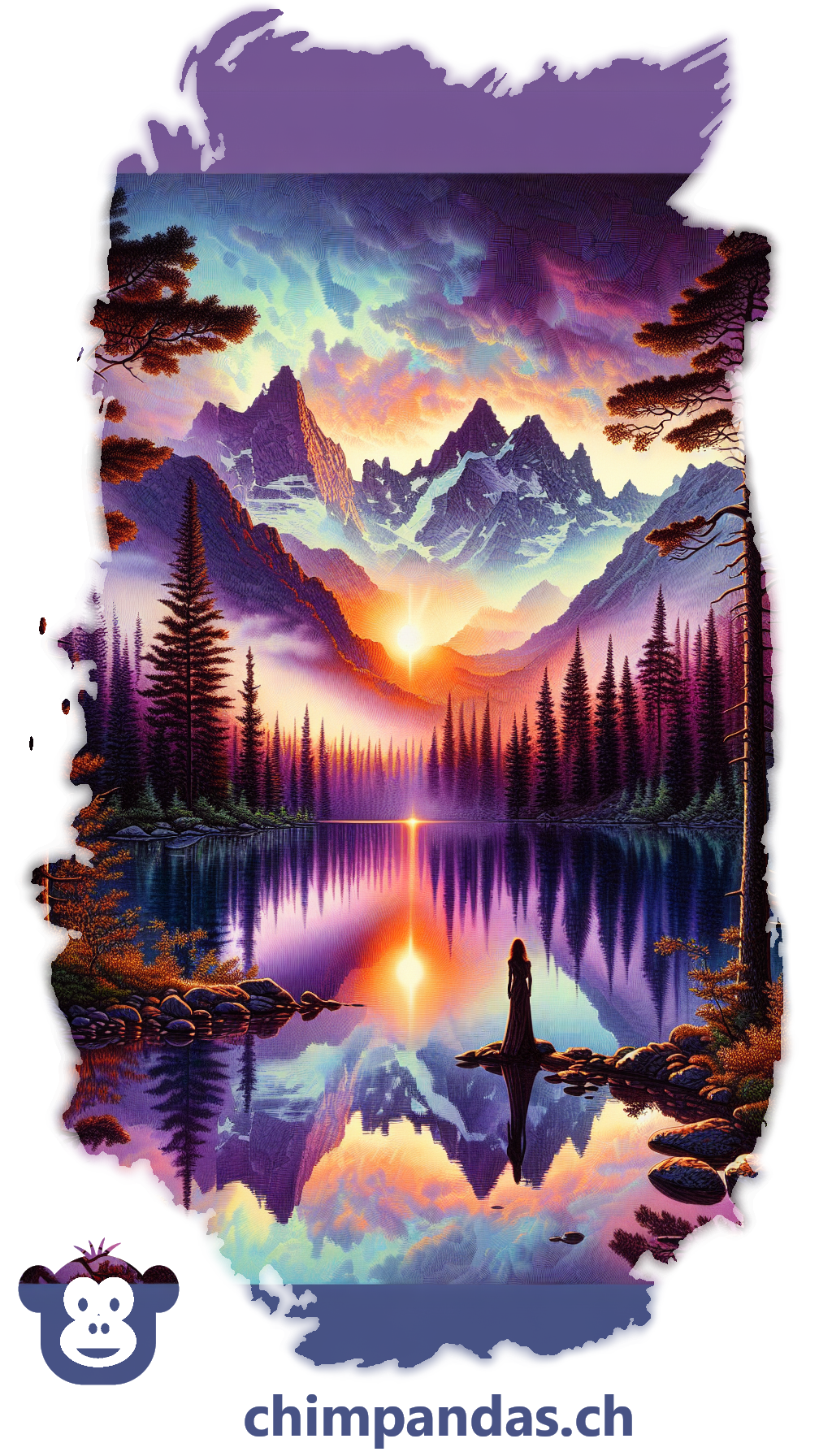 Title: Serene Sunset over Snow-Capped Peaks Description: Imagine a breathtaking scene set in a remote, untouched wilderness where tranquility reigns supreme. In the foreground, a crystal-clear alpine lake reflects the warm hues of a setting sun, creating a shimmering canvas of oranges, pinks, and purples. The surface of the water is still, mirroring the cloudy sky above, painted in soft pastel shades as the sun dips below the horizon. Nestled in the embrace of majestic snow-capped peaks, the lake is surrounded by lush, evergreen forests that cling to the mountainsides. The trees stand tall and proud, their deep green foliage providing a stark contrast to the fading light of the sky. Wisps of fog start to creep in from the valleys below, adding an ethereal quality to the scene. As the sun's rays fade, the mountains are cast in shades of deep blue and purple, hinting at the coming night. Yet, the last vestiges of daylight still linger, casting a warm glow over the landscape. A gentle breeze stirs the branches of the trees, creating a soft rustling sound that harmonizes with the song of distant birds. In the distance, a lone figure stands on the shore of the lake, silhouetted against the stunning backdrop of the sunset. Their presence adds a sense of scale to the scene, emphasizing the grandeur of nature's beauty. The figure gazes out at the spectacle before them, lost in contemplation and awe at the majesty of the natural world. This image encapsulates a moment of serenity and peace, inviting the viewer to pause and reflect on the wonders of the natural world. It serves as a reminder of the beauty that surrounds us, if only we take the time to stop and appreciate it.