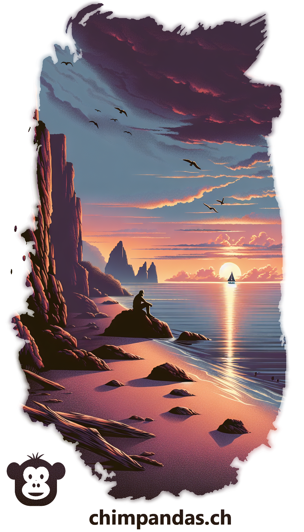 Title: Serene Sunset at Seaside Cliff Description: The view is set along the rugged coastline of a secluded beach, with a tall cliff rising to the left side of the frame. The setting sun casts a warm, golden glow across the scene, painting the sky in hues of orange, pink, and purple. Soft, wispy clouds catch the last light of day, creating a dreamy atmosphere. In the foreground, a stretch of powdery sand is dappled with shadows from rocks and driftwood scattered across the shore. The tranquil ocean gently laps at the shoreline, its surface reflecting the brilliant colors of the sky above. A lone figure sits at the cliff's edge, their silhouette outlined against the vibrant sunset. They appear lost in thought, gazing out at the horizon with a sense of quiet contemplation. Nearby, a family of seagulls glides gracefully on the ocean breeze, their calls blending with the soothing sound of the waves. Further out to sea, a sailboat bobs on the water, its white sails billowing in the evening breeze. The distant outlines of rugged islands can be seen on the horizon, adding depth and mystery to the coastal landscape. As the sun dips lower, the scene is bathed in a soft, ethereal light, casting long shadows and intensifying the rich colors of the setting sky. The overall mood is one of serenity and peace, a moment frozen in time that inspires a sense of awe and tranquility.