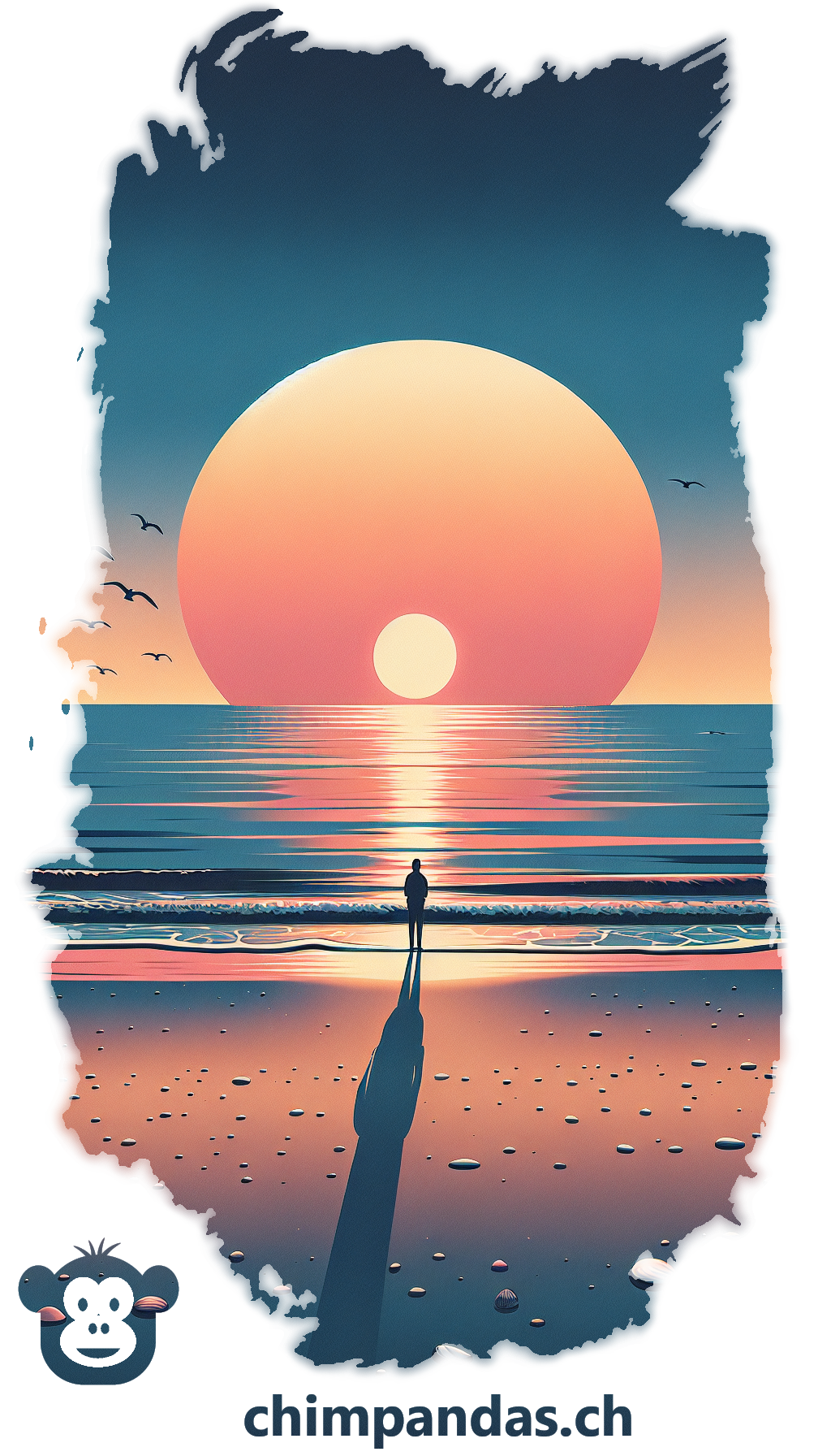 Title: Serene Sunset Description: In this stunning image, capture the essence of a tranquil beach scene during the golden hour. The sun is casting warm hues across the sky, creating a soft glow that envelops the landscape. The beach stretches out towards the horizon, dotted with seashells and gently lapping waves. A lone figure, silhouetted against the vibrant sky, stands at the water's edge, gazing out at the breathtaking view. The scene is imbued with a sense of peace and serenity, inviting the viewer to pause and appreciate the beauty of nature. The colors of the sky transition from a soft pastel pink near the horizon to a deep orange at the zenith, blending seamlessly with the gentle blues of the ocean. Seagulls soar overhead, their graceful silhouettes adding to the tranquil atmosphere of the scene. The sand is illuminated by the fading light, casting long shadows that create a sense of depth and texture. The entire composition exudes a sense of calm and contemplation, making it a perfect depiction of a serene sunset by the sea.