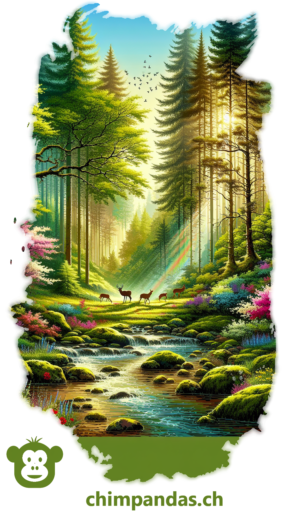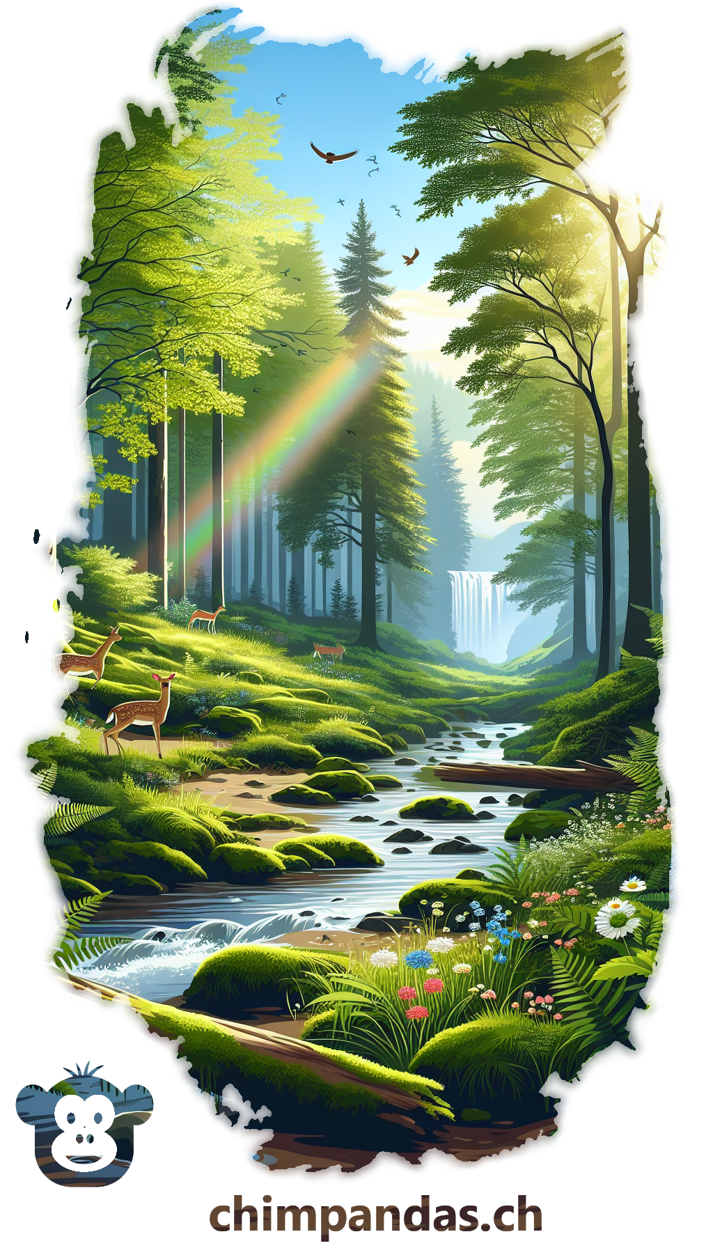 Description: Image of a serene and lush forest, with sunlight streaming through the dense foliage. The vibrant green leaves of various trees shimmer as they sway gently in the breeze. A small, crystal-clear stream meanders through the forest, its gentle gurgling adding to the tranquil atmosphere. Moss-covered rocks line the edges of the stream, adding a touch of earthy charm to the scene. Vibrant wildflowers in shades of pink, purple, and yellow dot the forest floor, adding splashes of color to the greenery. A family of deer can be seen grazing peacefully in a sunlit clearing, their graceful forms blending seamlessly with the natural beauty surrounding them. In the distance, a majestic waterfall cascades down a rocky cliff, its mist creating a beautiful rainbow in the sunlight. Birds flit from tree to tree, their melodic songs adding to the symphony of nature's choir. The air is filled with the sweet scent of pine and damp earth, creating a sense of harmony and peace in this enchanting forest oasis. The scene evokes a feeling of serenity and connection to the natural world, inviting the viewer to pause, breathe, and immerse themselves in the beauty of the forest.