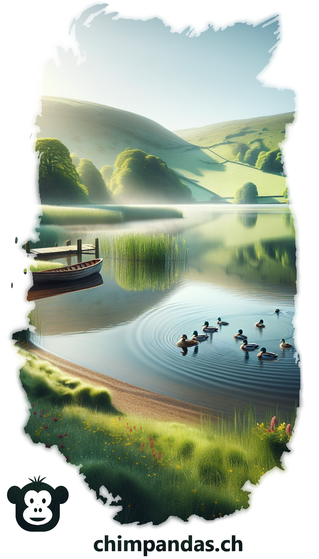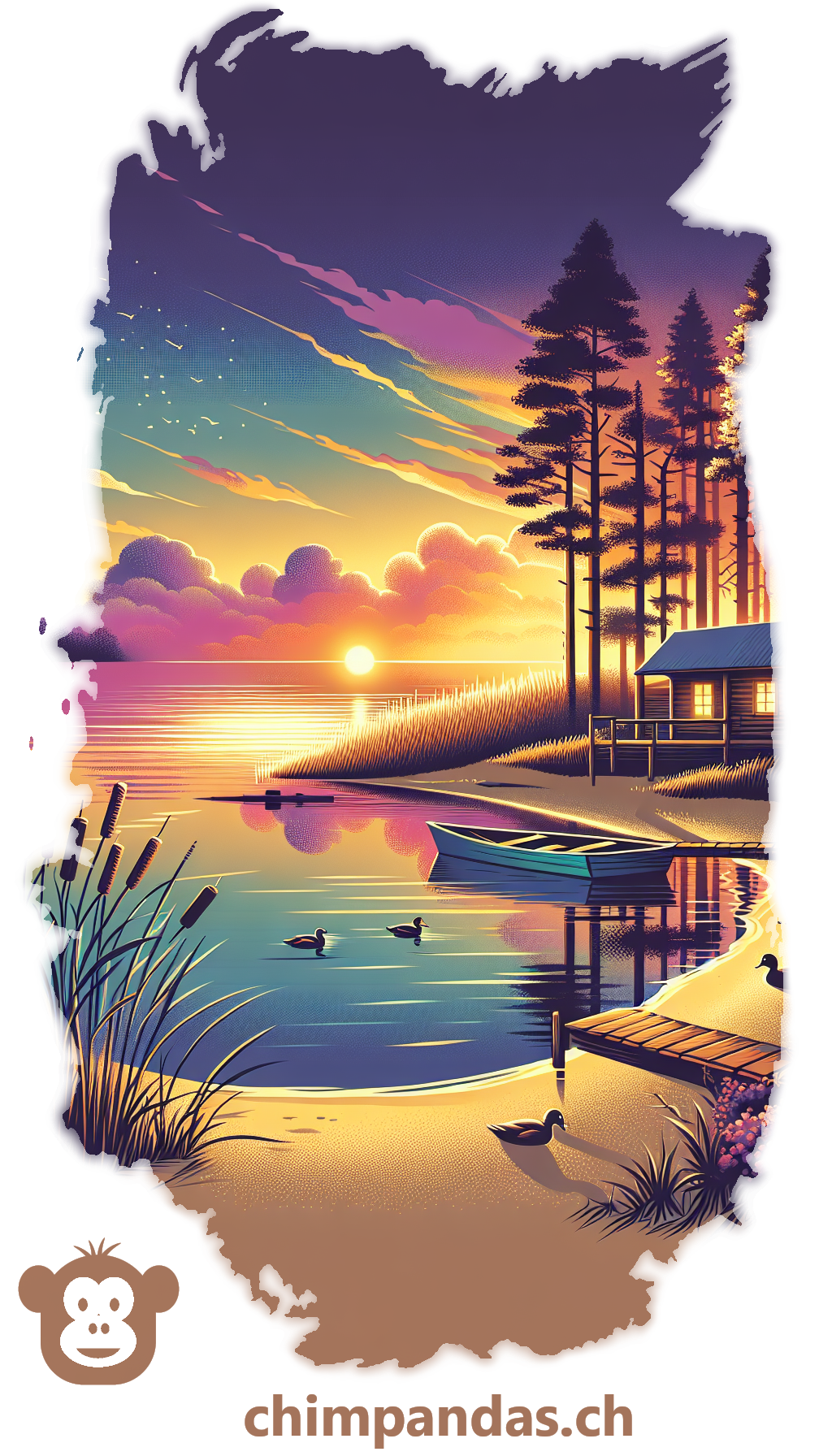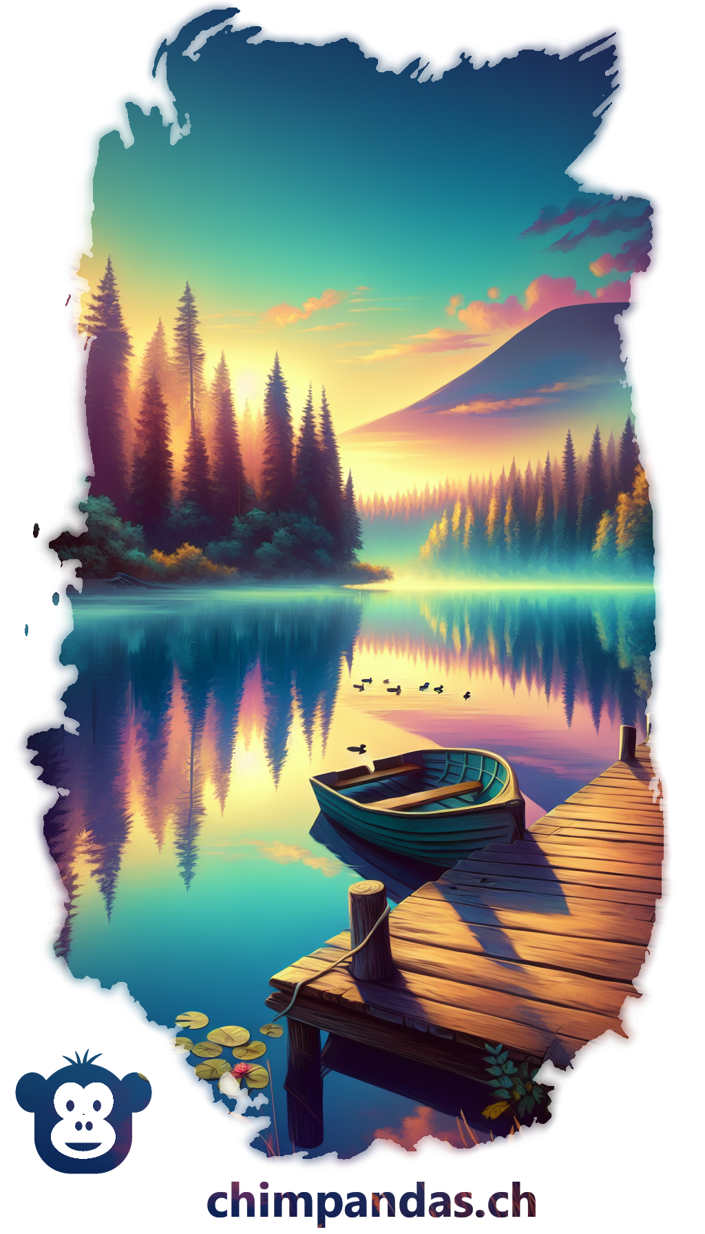 Title: Serene Morning on the Lakeshore Description: Imagine a peaceful scene by a calm lakeshore on a beautiful morning. The image captures the essence of tranquility and natural beauty. In the foreground, a family of ducks leisurely glides across the mirror-like surface of the water, leaving gentle ripples in their wake. Patches of colorful wildflowers dot the lush green grassy bank, adding a vibrant touch to the landscape. Overhead, a clear blue sky stretches out, with the early morning sun casting a soft, golden glow over the entire scene. The air is crisp and fresh, carrying with it the scent of pine trees and morning dew. A light mist hovers just above the surface of the lake, creating a dreamy, ethereal effect. In the distance, rolling hills covered in emerald forests provide a stunning backdrop to the tranquil lakeshore. A lone rowboat is moored at a wooden dock, its oars resting against its sides, hinting at a peaceful outing soon to be enjoyed. As you take in this serene morning on the lakeshore, you can almost hear the gentle lapping of the water against the shore and the distant chirping of birds welcoming the new day. It's a moment frozen in time, inviting you to pause, breathe deeply, and appreciate the beauty of nature surrounding you.