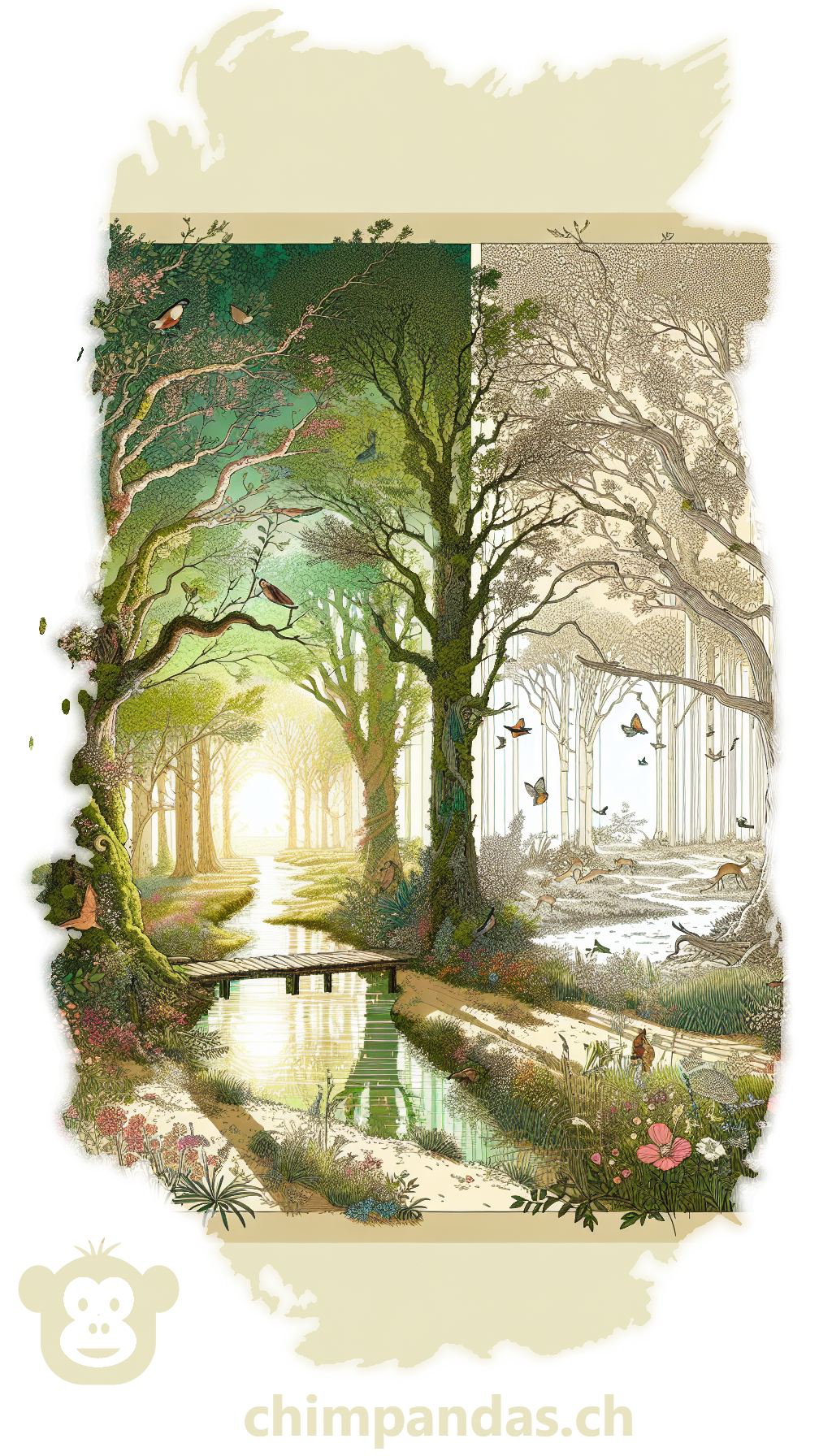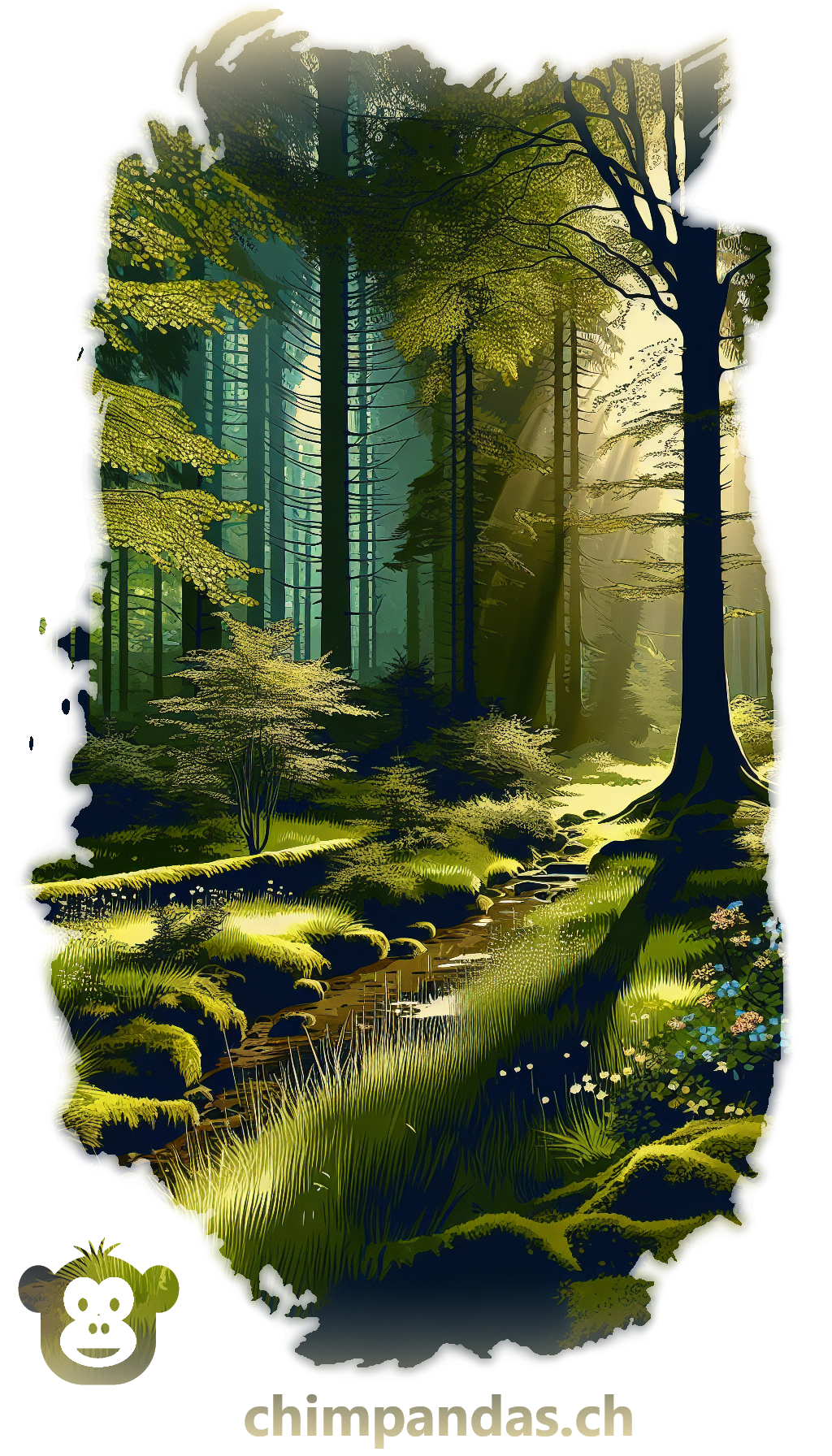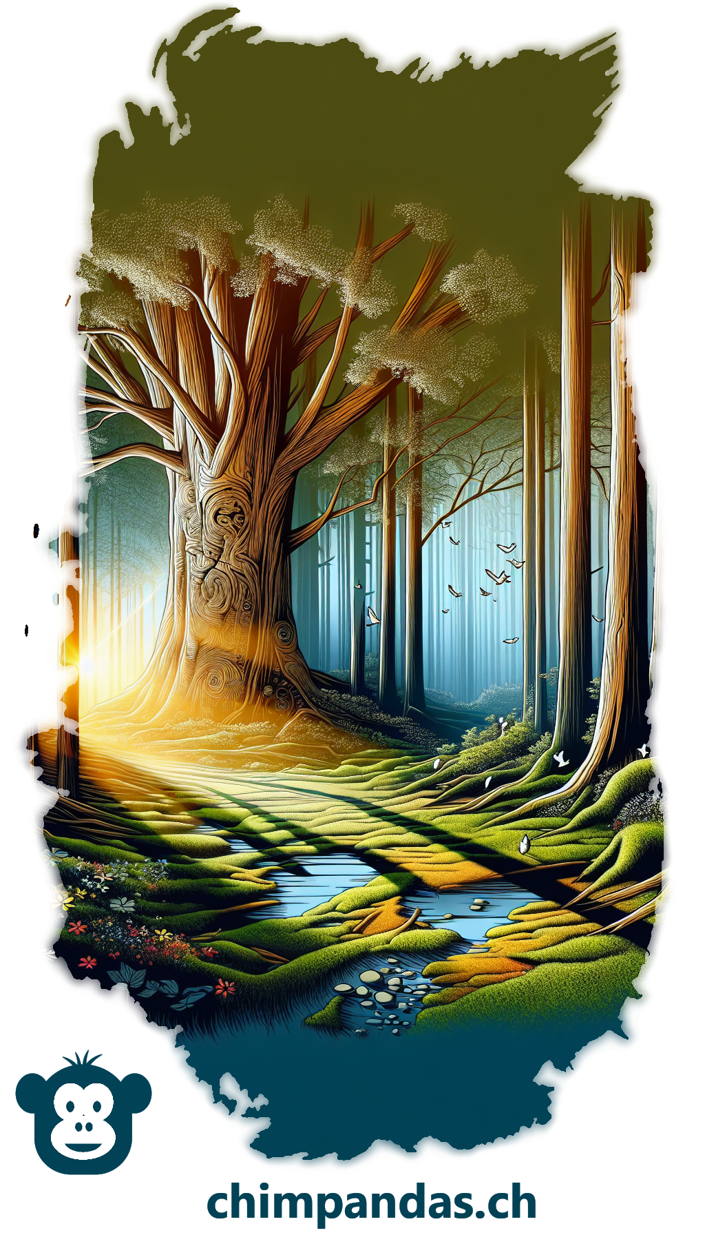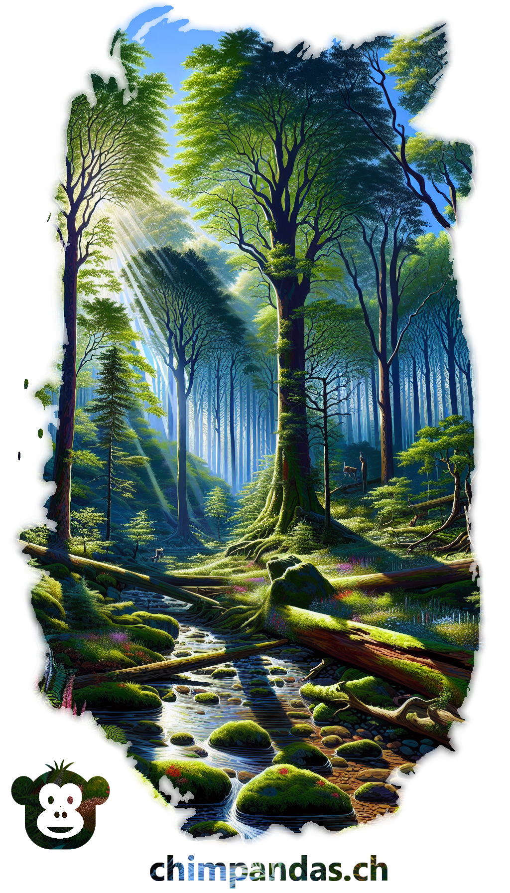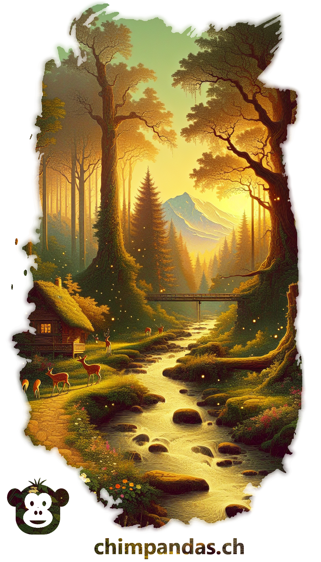 Image Description: In the heart of a lush forest, a gentle stream meanders through a vibrant landscape. Towering ancient trees with sprawling branches provide a canopy of shade overhead, filtering the golden sunbeams that peek through the leaves. The forest floor is a carpet of various shades of green, dotted with colorful wildflowers in full bloom. A family of deer gracefully graze near the stream, their soft, attentive eyes glancing around inquisitively. As the stream flows lazily over smooth rocks, small ripples break the surface, creating a soothing melody that harmonizes with the symphony of bird song all around. Further along the stream, a picturesque wooden bridge stretches across its width, its weathered planks a stark contrast to the vibrant nature surrounding it. The bridge leads to a quaint cottage nestled amongst the trees, its walls covered in climbing vines and blooming roses. Smoke gently curls from the stone chimney, carrying the scent of crackling firewood and a hint of fresh-baked bread. In the distance, the majestic outline of a snow-capped mountain range can be seen, their peaks piercing the azure sky. Wispy clouds cling to the mountaintops, casting soft shadows over the serene landscape below. A gentle breeze rustles the leaves, carrying with it the promise of adventure and tranquility in equal measure. As the evening sun begins its descent, casting a warm glow over the scene, fireflies start to dance in the gathering dusk, a twinkling constellation of light amidst the encroaching darkness. The harmony of nature paints a picture of peace and serenity, inviting all who behold it to lose themselves in the beauty of the natural world.