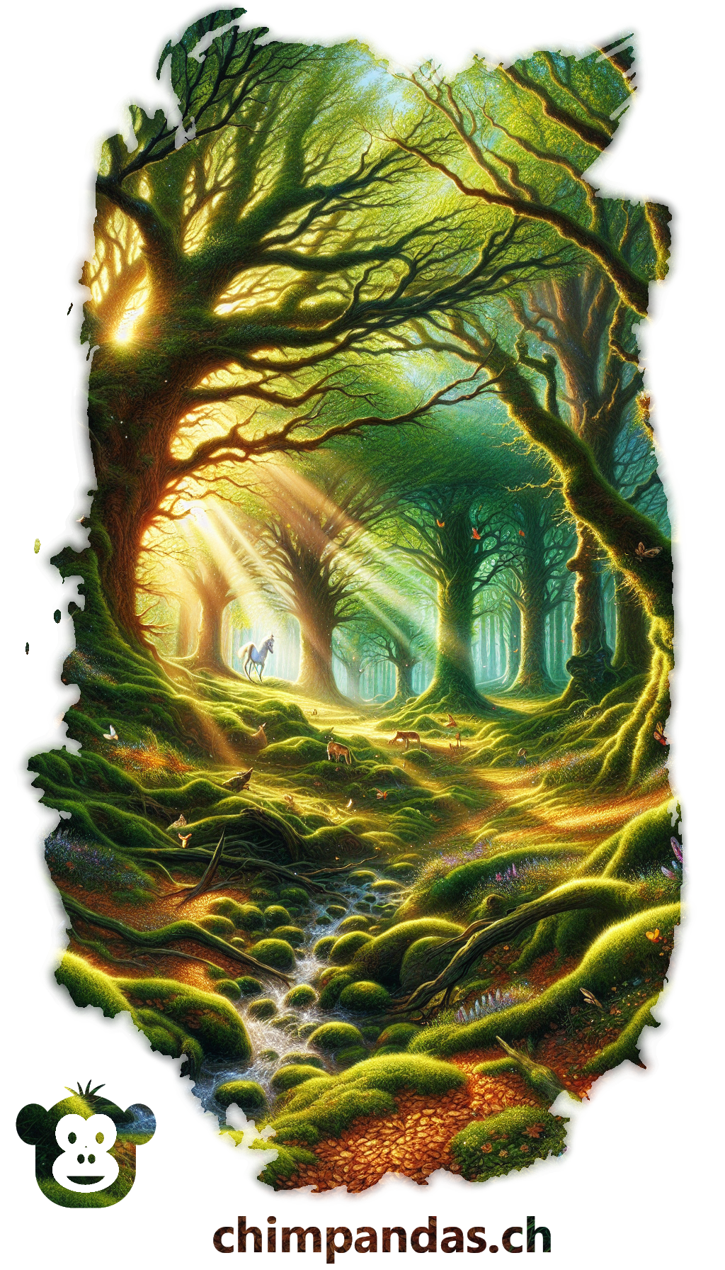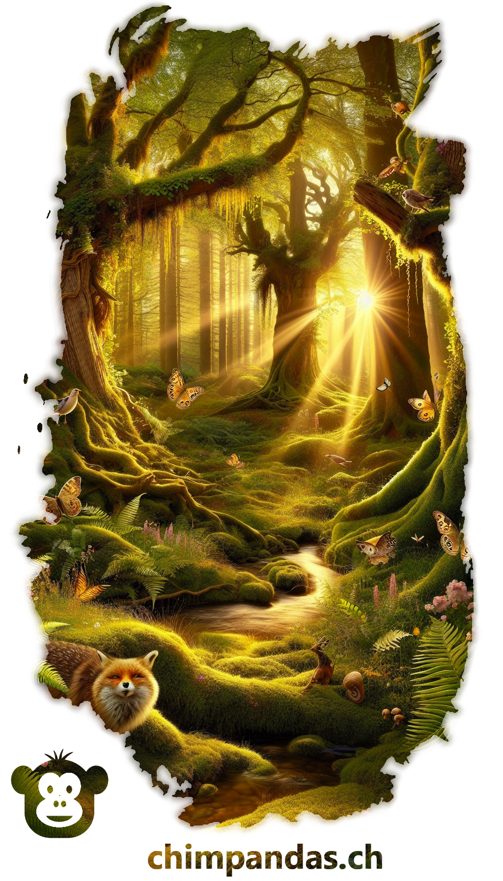 Title: Enchanted Forest Description: In a mystical forest bathed in golden sunlight, ancient trees stand tall and proud, their gnarled roots intertwining with lush green ferns and delicate wildflowers. Sunbeams filter through the canopy, casting a warm glow on the moss-covered ground below. Birds flit from branch to branch, their melodic songs filling the air with a symphony of nature's music. A crystal-clear stream meanders through the heart of the forest, its gentle babbling providing a soothing soundtrack to the scene. Butterflies dance among the vibrant blooms of wild roses and jasmine, their colorful wings adding a touch of magic to the tranquil setting. Small woodland creatures venture out from their cozy burrows and hiding spots, eager to explore the wonders of their enchanted home. Squirrels dart among the branches, while rabbits nibble on tender shoots of grass. A majestic deer, its antlers crowned with fresh green leaves, pauses at the edge of a clearing to survey its domain with regal grace. Overhead, a family of owls perches on a moss-covered branch, their wise eyes watching over the forest with a keen gaze. The air is alive with the symphony of nature - the rustle of leaves, the chirping of crickets, and the distant call of a hidden woodpecker. As you stand in the heart of this enchanted forest, all worries and stress melt away, replaced by a sense of peace and wonder at the beauty of the natural world. The magic of the forest whispers to your soul, inviting you to explore its hidden depths and discover the secrets it holds within its leafy embrace.
