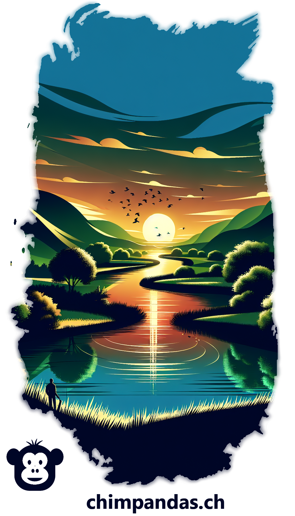 Title: Sunset Serenity Description: Imagine a breathtaking scene where the setting sun casts a warm glow over a tranquil landscape. In the foreground, a serene river meanders peacefully through lush greenery, reflecting the vibrant hues of the sky above. As the sun dips below the horizon, its golden rays create a mesmerizing play of light and shadow across the water's surface. The distant silhouette of rolling hills enhances the peaceful atmosphere, adding depth to the picturesque view. Birds soar gracefully in the dusky sky, their elegant wings catching the last remnants of daylight. A lone figure stands at the riverbank, gazing out at the horizon with a sense of quiet contemplation. The overall ambiance is one of tranquility and harmony, inviting the viewer to pause and appreciate the beauty of nature's final display before nightfall. Whether for relaxation or reflection, this scene evokes a sense of peace and serenity that envelops the viewer in a calming embrace.