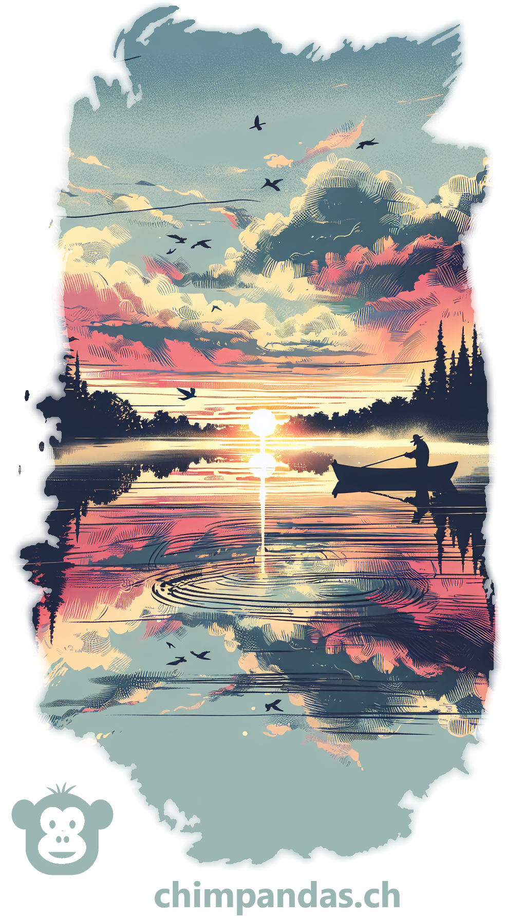 Title: Serene Sunrise Description: In this peaceful scene, a magnificent sunrise paints the sky in hues of pink, orange, and gold, casting a warm glow over a tranquil landscape. The sky is filled with wispy clouds, illuminated by the first light of day, creating a stunning display of colors that are reflected in a calm, mirrored lake below. The water's surface is still, broken only by gentle ripples that fan outwards from a wooden boat gliding silently across the water. The boat is occupied by a lone figure, a fisherman perhaps, who is casting a line into the lake, surrounded by the quiet beauty of nature awakening to a new day. On the far shore, a forest of tall trees stands silhouetted against the brightening sky, their branches reaching upwards towards the horizon. Birds circle overhead, their calls blending with the rustling of leaves and the soft lapping of water against the shore. The air is crisp and fresh, carrying the scent of damp earth and pine. In the distance, mist hangs low over the horizon, adding to the ethereal quality of the scene. This peaceful setting offers a moment of respite from the hustle and bustle of daily life, inviting the viewer to pause and appreciate the beauty of the natural world.