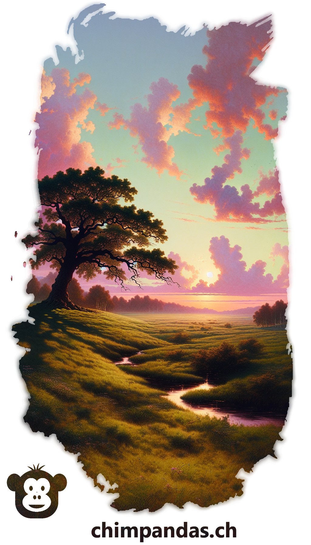 Description: In this serene setting, a lush green meadow stretches far into the distance, kissed by the warm glow of the setting sun. The sky above is painted in hues of pink, orange, and soft purple, creating a perfect backdrop for the scene. Wispy clouds float gently across the sky, adding a touch of whimsy to the tranquil atmosphere. A lone oak tree stands proudly in the center of the meadow, its branches reaching out in all directions as if embracing the beauty that surrounds it. In the distance, a small stream winds its way through the landscape, its clear waters glistening in the fading light. The air is filled with the sweet scent of wildflowers and fresh grass, inviting anyone to stop and take a moment to appreciate the beauty of nature. As the sun dips below the horizon, casting long shadows across the meadow, a sense of peace and tranquility washes over the scene, leaving a lasting impression of serenity and beauty.
