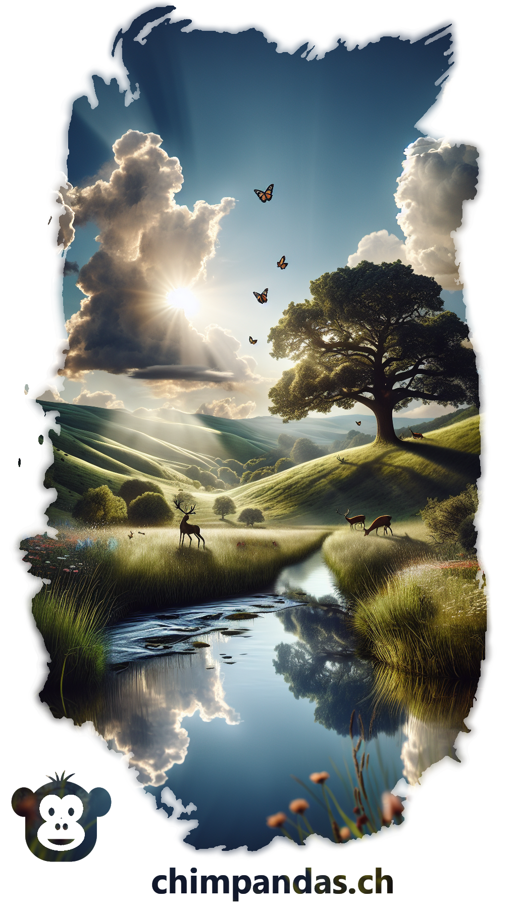 Image Description Prompt: --- Observe an enchanting scene in a lush, verdant meadow under a clear cerulean sky dotted with fluffy cumulus clouds. In the foreground, a majestic oak tree stretches its branches towards the heavens, its leaves rustling gently in the breeze. Beneath the tree, a delicate brook glistens as it winds its way through the grass, reflecting the sunlight like a trail of liquid diamonds. On the left side of the image, a small family of deer grazes peacefully, their elegant forms a study in graceful movement amidst the tranquility of their surroundings. A pair of butterflies flit and dance around a cluster of brightly colored wildflowers, adding a touch of whimsy to the serene tableau. In the background, rolling hills cloaked in emerald green provide a stunning backdrop to the idyllic scene, hinting at endless possibilities beyond the immediate horizon. Soft sunlight bathes the entire landscape in a warm golden glow, imbuing the air with a sense of magic and wonder. As you gaze upon this enchanting vista, you can almost feel the cool grass beneath your feet, hear the gentle rustle of leaves overhead, and feel a profound sense of peace and harmony wash over you. The beauty of nature surrounds you, inviting you to pause, breathe deeply, and savor the simple joys of life in all its natural splendor. --- Feel free to use this image description prompt to inspire your AI to create a vivid and evocative visual scene based on the keywords provided.