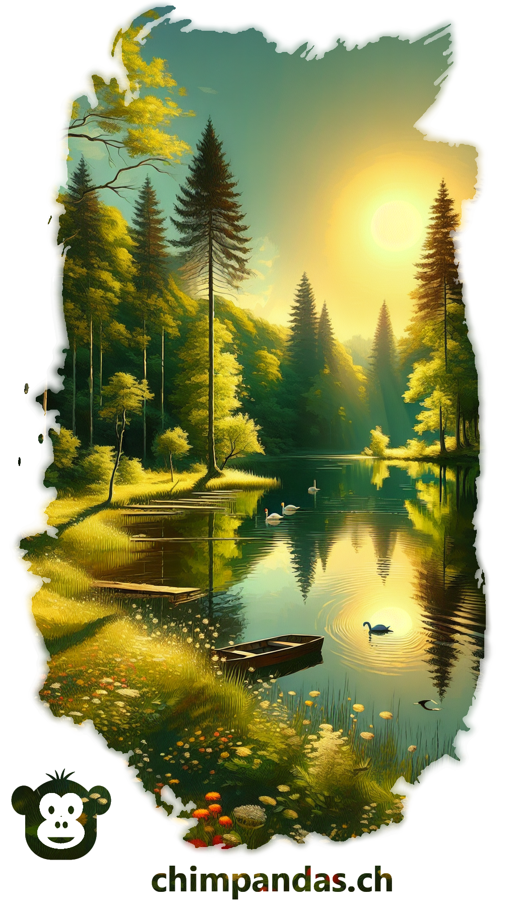 Title: Serene Forest Lake Description: In the heart of a lush green forest lies a tranquil lake, its surface shimmering under the warm golden rays of the afternoon sun. Tall, majestic trees form a protective canopy above, casting dappled shadows that dance across the lake's placid waters. The gentle rustling of leaves intermingles with the soothing sounds of chirping birds and the occasional splash of a fish leaping out of the water. Wildflowers of various colors dot the grassy banks, adding splashes of vibrant hues to the serene landscape. A couple of swans gracefully glide across the lake, their pure white feathers creating a striking contrast against the verdant surroundings. A family of ducks swims near the shore, their fluffy ducklings trailing closely behind, so adorable that they could easily warm even the coldest heart. At the far end of the lake, a small wooden rowboat is moored to a weathered dock, inviting visitors to explore the peaceful waters at their own pace. The reflection of the surrounding trees and the clear blue sky above is mirrored on the mirror-like surface of the lake, creating a mesmerizing kaleidoscope of colors and shapes. As the sun begins its slow descent towards the horizon, casting a warm, golden glow over the entire scene, the air is filled with a sense of tranquility and harmony. This idyllic setting offers a welcome escape from the hustle and bustle of everyday life, a perfect sanctuary for anyone seeking a moment of peace and connection with nature.