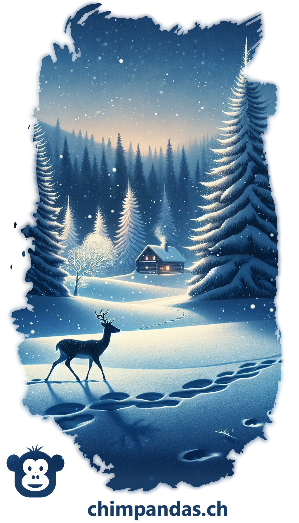 Description: In this image, gentle snowflakes are delicately falling from the sky, creating a serene and peaceful winter scene. The landscape is blanketed in a thick layer of snow, transforming everything into a winter wonderland. Tall pine trees covered in white snow stand proudly in the background, contrasting against the deep blue hue of the sky. In the foreground, a graceful deer is gracefully making its way through the snow, leaving behind a trail of delicate hoof prints. Its breath creates a faint mist in the cold air, adding to the tranquility of the setting. The soft glow of a distant cabin's warm light further enhances the beauty and coziness of this winter scene. The entire atmosphere is one of calmness and beauty, inviting the viewer to appreciate the quiet magic of winter.