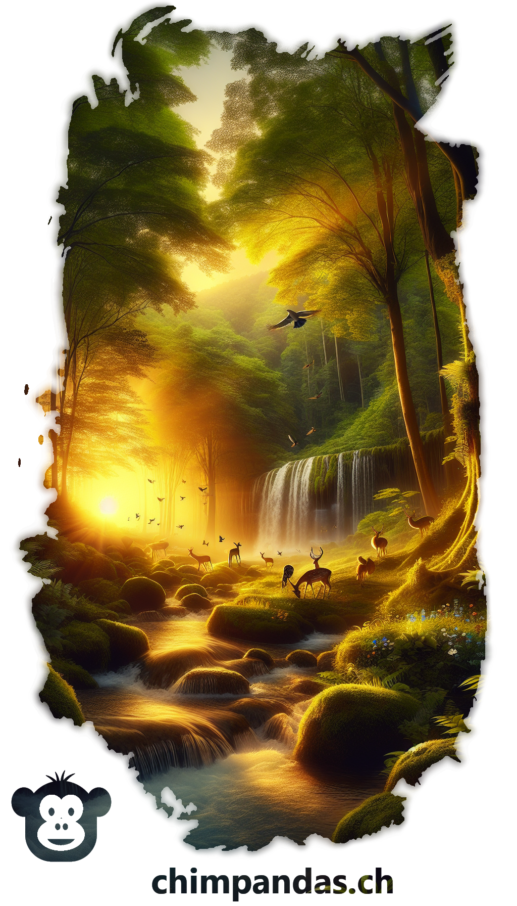 Imagine a serene, picturesque scene set in a lush, verdant forest during the golden hour of the evening. The sun slowly descends in the sky, casting a warm, amber glow over the treetops, creating a magical interplay of light and shadow. A gentle breeze rustles the leaves, causing a symphony of soft whispers to fill the air. In the midst of this tranquil setting stands a majestic waterfall cascading down a series of rugged rocks, its crystal-clear waters shimmering in the fading light. Birds flit from tree to tree, their melodic songs echoing throughout the forest. A family of deer grazes peacefully nearby, their graceful movements a testament to the harmony of nature. Wildflowers and ferns carpet the forest floor, adding bursts of vibrant color to the otherwise green landscape. The overall atmosphere is one of peace and serenity, inviting the viewer to pause, breathe, and immerse themselves in the soothing beauty of the natural world.