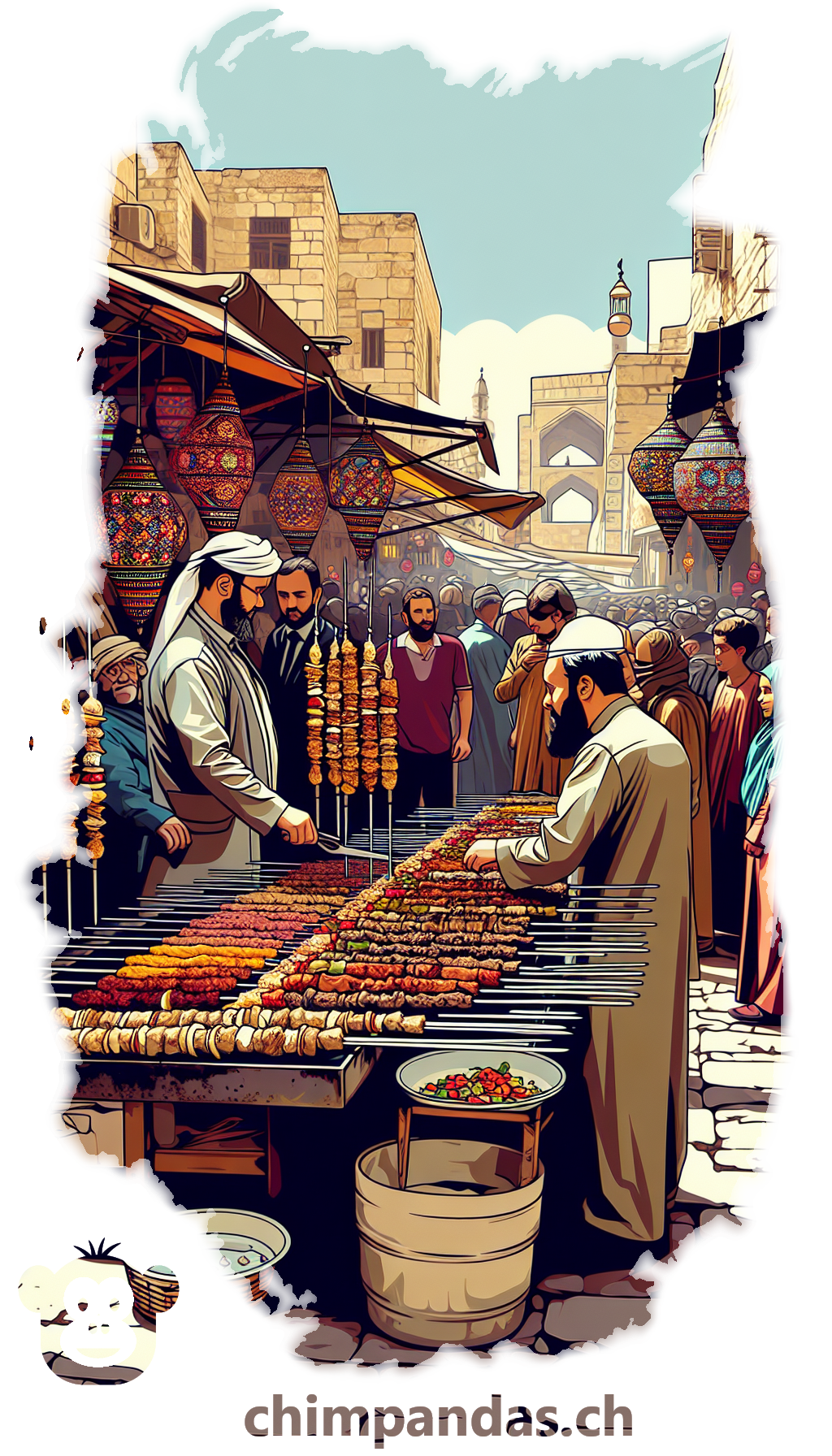 In this image, we see a vibrant and bustling street market in a Middle Eastern city. The scene is filled with colorful stalls adorned with rich tapestries and intricate lanterns, creating a warm and inviting ambiance. The focal point of the image is a bustling kebab stand, where a skilled vendor is expertly skewering marinated meats and vegetables on long metal rods. The aroma of sizzling meats and exotic spices fills the air, enticing passersby to stop and sample the delicious offerings. Customers, both locals and tourists, eagerly line up to order their choice of succulent kebabs, accompanied by fragrant rice, fresh salads, and creamy sauces. The vendor, dressed in traditional attire, skillfully flips the skewers over a charcoal grill, creating a symphony of sizzles and crackles. The scene is alive with energy and excitement, as people mingle and chat while enjoying their flavorful meals. In the background, the narrow streets are lined with ancient stone buildings, their weathered facades bearing the scars of time. The sound of traditional music can be heard in the distance, adding to the vibrant atmosphere of this bustling marketplace. It is a snapshot of a moment in time, capturing the essence of a rich culinary tradition and the spirit of camaraderie that comes with sharing a meal together.