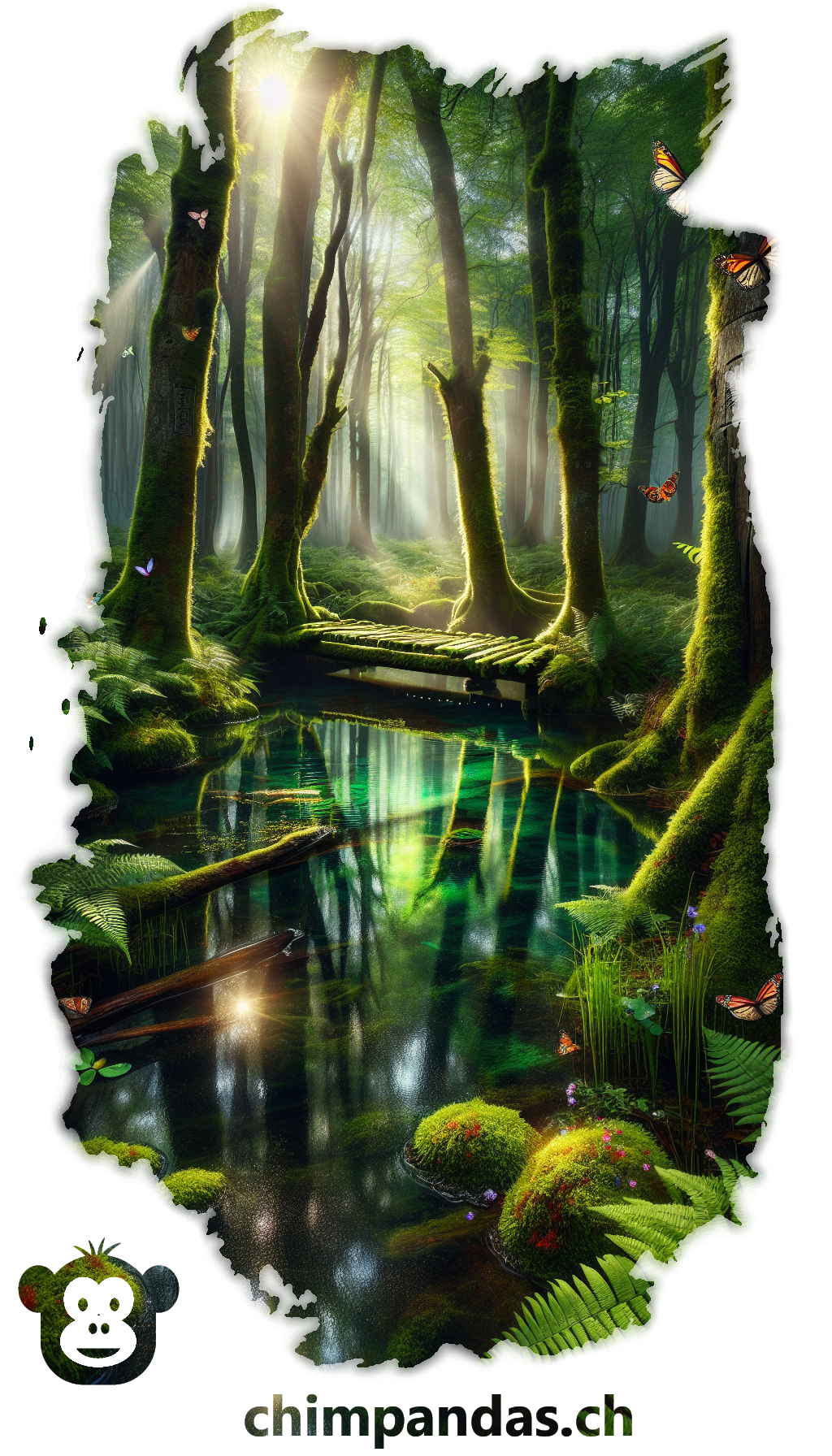 Title: Enchanted Forest Haven Description: In the heart of a lush, ancient forest, a hidden pond glistens under the soft, filtered sunlight that filters through the canopy above. The water is crystal clear, reflecting the emerald hues of the surrounding ferns and moss-covered rocks. A delicate mist floats over the surface, shrouding the area in an ethereal glow. Vivid wildflowers bloom along the water's edge, their fragrant scent perfuming the air. A wooden footbridge arches over the pond, its weathered planks adorned with soft, velvety moss. Tall, majestic trees stand sentinel around the pond, their trunks adorned with intricate carvings and symbols that tell stories of ancient times. Sunbeams pierce through the dense foliage, casting patterns of light and shadow on the forest floor. Tiny, iridescent dragonflies flit among the reeds, their wings shimmering like stained glass in the sunlight. Butterflies of every color dance on the gentle breeze, creating a kaleidoscope of movement and beauty. The soft, melodic chirping of birds weaves through the air, creating a soothing symphony of nature's harmonies. At the far end of the pond, a small, rustic cabin stands nestled among the trees. Its walls are woven from branches and vines, blending seamlessly with the natural surroundings. Smoke curls lazily from the stone chimney, carrying the sweet scent of woodsmoke and wildflowers. This hidden haven exudes an aura of tranquility and magic, a sanctuary where one can escape the chaos of the outside world and immerse themselves in the beauty of nature. It beckons the weary traveler to rest and rejuvenate, to find solace and peace in the embrace of the enchanted forest.