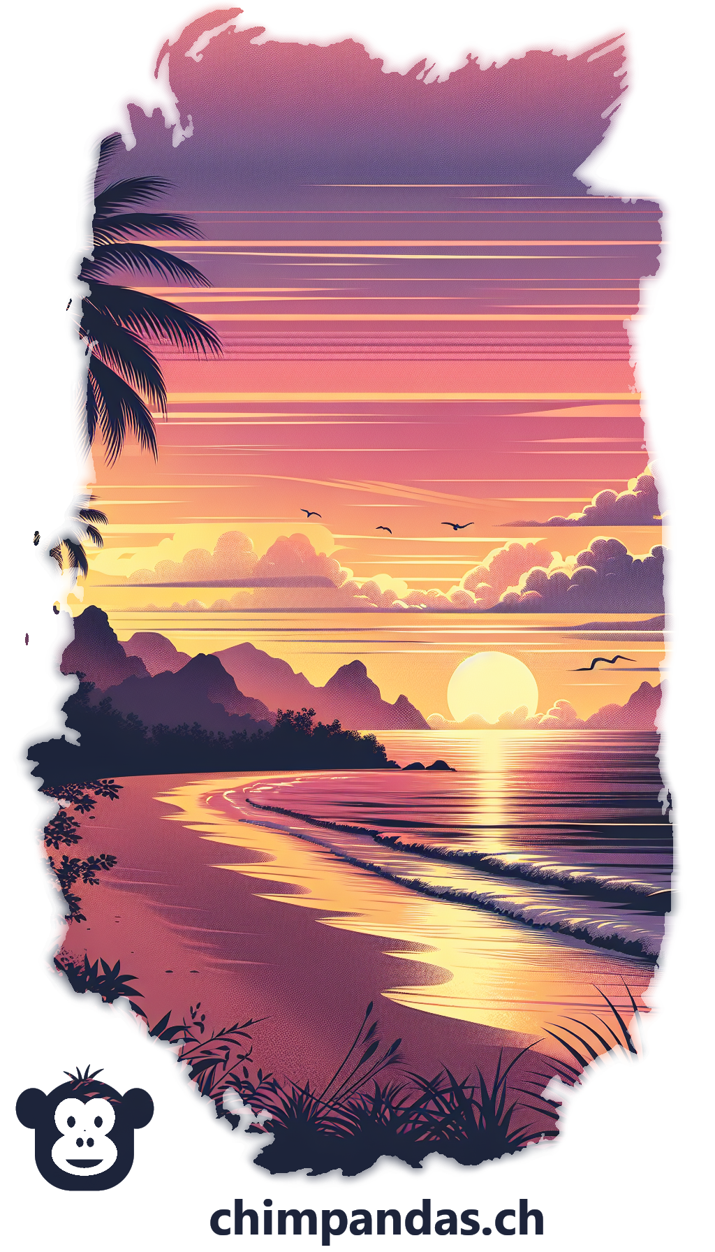 Title: "Sunset Serenity" Description: In this picturesque scene, the setting sun casts a warm, golden glow over a tranquil coastal landscape. The sky is painted in hues of pink, orange, and purple, creating a breathtaking display of colors that stretch across the horizon. Wispy clouds drift lazily overhead, catching the final rays of sunlight before nightfall descends. In the foreground, a serene beach stretches out, its pristine white sand kissed by gentle waves that lap at the shore. A lone palm tree sways in the breeze, its fronds rustling softly against the backdrop of the shimmering sea. The water glistens in the fading light, reflecting the vibrant colors of the sky above. Further inland, a lush tropical forest emerges, its deep green foliage bathed in the warm glow of the setting sun. Tall trees reach skyward, their branches creating a natural canopy that filters the fading sunlight into dappled patterns on the forest floor. Exotic birds flit among the branches, their colorful plumage adding flashes of brightness to the verdant landscape. In the distance, rugged mountains loom on the horizon, their jagged peaks silhouetted against the evening sky. The last remnants of daylight cast a soft pink hue on the rocky slopes, creating a dramatic contrast with the deepening shadows. Overall, this image captures the essence of tranquility and natural beauty, inviting the viewer to pause and appreciate the majesty of the natural world. Whether it's the peaceful lull of the ocean waves, the vibrant colors of the sunset sky, or the untouched wilderness of the forest and mountains, this scene is a feast for the senses and a reminder of the awe-inspiring power of nature.