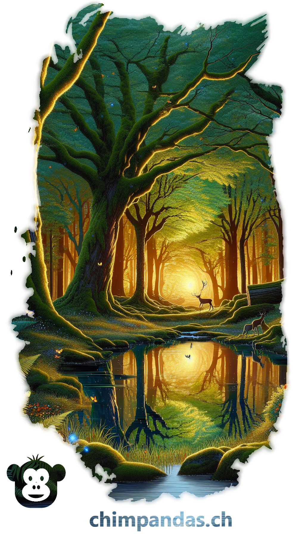 Title: Enchanted Forest Glade Description: In the heart of a lush, ancient forest, a serene glade emerges, bathed in the soft golden light of the setting sun. Towering trees with thick, moss-covered trunks form a protective canopy overhead, filtering the warm glow into dappled patterns on the forest floor. The air is filled with the earthy scent of damp soil and the sweet perfume of wildflowers blooming nearby. A small, crystal-clear stream meanders through the glade, its gentle gurgling providing a soothing backdrop to the symphony of nature’s sounds. Delicate ferns unfurl their emerald fronds along the water's edge, while colorful butterflies flit lazily from one blossom to another. In the distance, a shimmering pond reflects the vibrant hues of the surrounding foliage, creating a mirror-like surface that seems to hold the secrets of the ancient woods. A family of deer cautiously emerges from the shadows, their graceful movements adding a touch of magic to the tranquil scene. As the day wanes and the stars begin to twinkle overhead, the enchanted forest glade comes alive with the mystical glow of fireflies dancing among the trees, casting soft, mesmerizing lights that seem to beckon visitors to linger a little longer in this hidden haven of beauty and wonder.