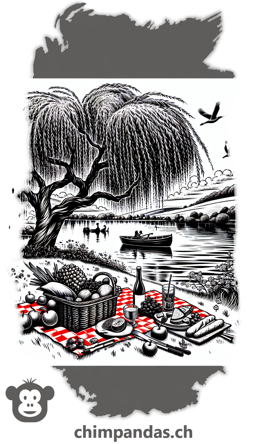 Description: ------------- Imagine a serene lakeside scene, where the water glistens under the warm sun. In the foreground, a majestic willow tree, its long, sweeping branches gracefully swaying in the gentle breeze. Underneath the tree, a colorful picnic blanket spread out, adorned with an array of delicious treats - a basket overflowing with fresh fruits, sandwiches, and a chilled bottle of lemonade. Nearby, a light breeze ruffles a red and white checkered cloth napkin, hinting at a delightful meal about to be shared. On the edge of the lake, a small rowboat gently bobs in the water, its oars resting against the sides. A pair of white swans glides peacefully across the water, their elegant forms casting soft reflections in the shimmering surface. In the distance, a family of ducks paddles happily, creating ripples that extend outward in ever-widening circles. Beyond the lake, rolling green hills dotted with wildflowers stretch into the horizon, their vibrant colors blending together in a beautiful tapestry of nature. Above, a clear blue sky is dotted with fluffy white clouds, casting shifting shadows on the landscape below. As you take in the scene, you can almost feel the warmth of the sun on your skin, hear the soft rustle of the leaves in the breeze, and smell the fresh scent of the outdoors. It's a moment of perfect tranquility, a snapshot of nature's beauty frozen in time.