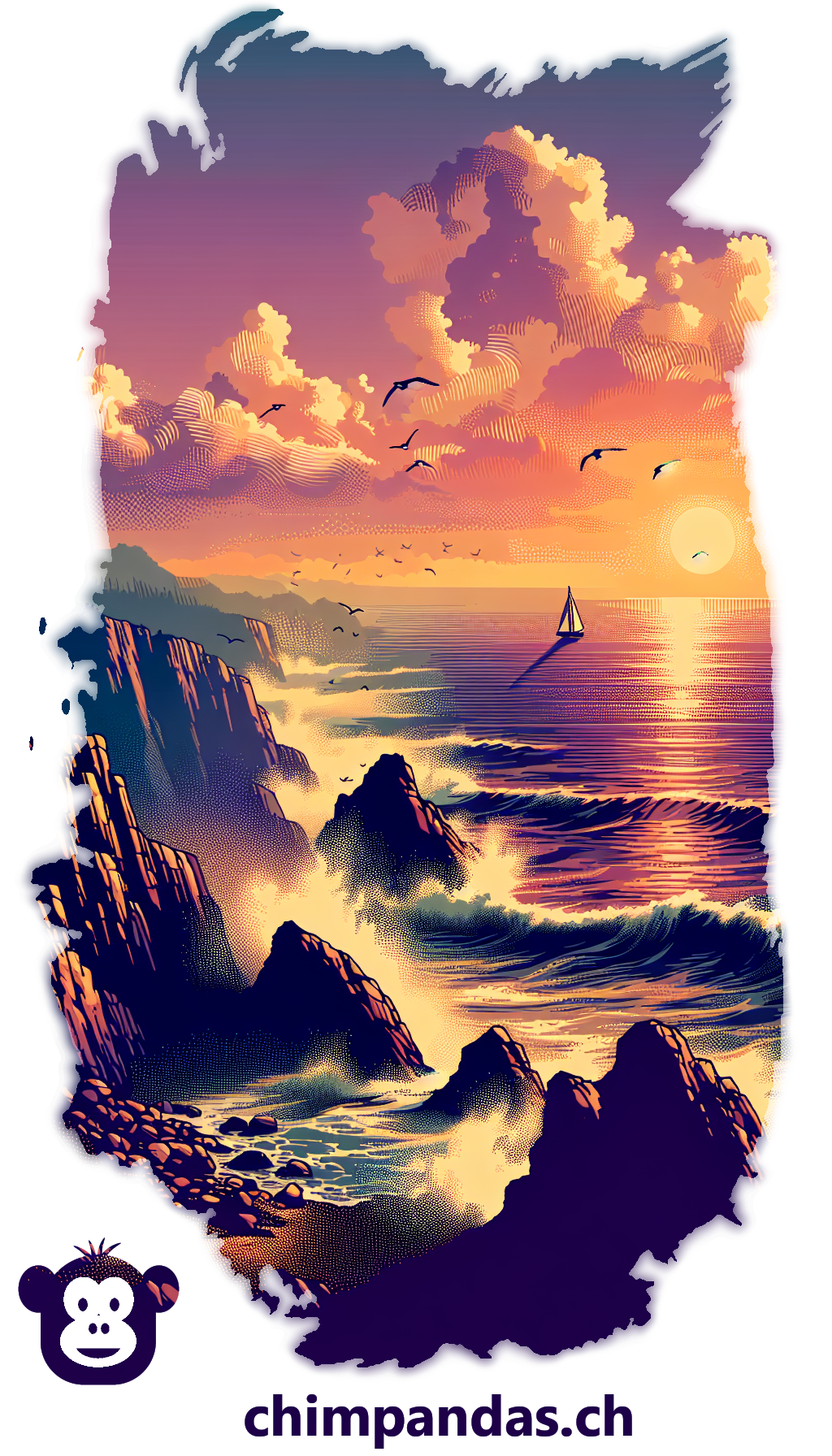 Title: Serene Sunset over Ocean Cliffs Description: Imagine yourself standing on a rugged cliff overlooking the vast expanse of the sea at sunset. The sky is awash with hues of orange, pink, and purple as the sun dips below the horizon, casting a warm and golden glow over the landscape. The waves crash against the rocks below, sending up a fine mist that catches the light and sparkles like diamonds in the fading light. In the distance, a lone sailboat glides across the water, its white sails billowing in the gentle breeze. As the last rays of sunlight dance across the surface of the ocean, the scene is bathed in a surreal, almost ethereal light that seems to transport you to another world. Seabirds wheel and dip overhead, their cries mingling with the sound of the crashing waves below. A sense of peace and tranquility settles over you as you take in the breathtaking beauty of the moment, feeling a deep connection to the natural world around you. As you stand there, surrounded by the beauty and majesty of nature, you are filled with a sense of wonder and awe at the intricate and harmonious dance of light, color, and sound that plays out before you. This is a moment to pause, to breathe, and to appreciate the simple yet profound beauty of the world we inhabit.