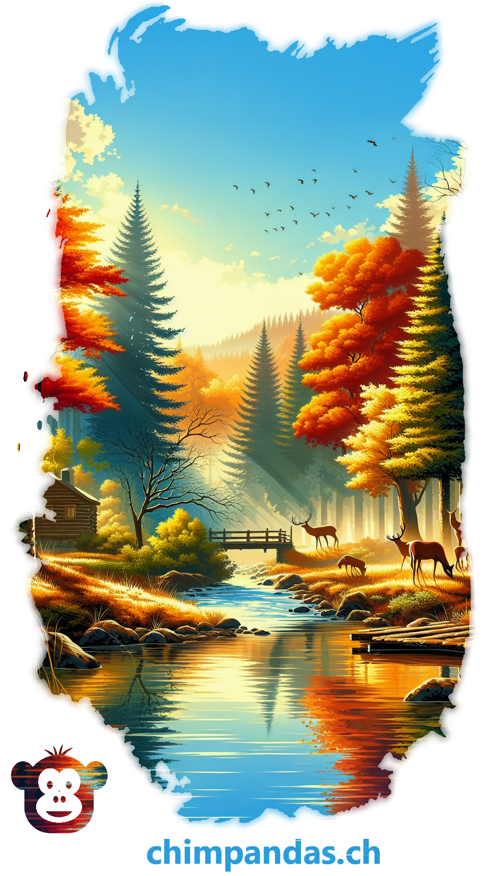 Below is a prompt for an AI based on the given keywords: Description of Image: The scene captures a serene forest during a vibrant autumn afternoon. The towering trees, adorned with golden and crimson leaves, stand majestically under a clear blue sky. The sunlight filters through the foliage, creating a warm and inviting atmosphere. In the foreground, a gentle stream meanders through the forest, its crystal-clear waters reflecting the colors of the changing leaves. A family of deer grazes peacefully by the water's edge, their coats blending harmoniously with the surroundings. Birds chirp happily, adding to the symphony of nature's sounds. An old wooden bridge crosses over the stream, its weathered planks telling stories of years gone by. Amidst this tranquil setting, a small cabin emerges, nestled among the trees, its chimney billowing smoke from a crackling fire within. The aroma of woodsmoke fills the air, evoking a sense of coziness. A small boat is tied to a nearby dock, inviting an adventure down the stream. The overall ambiance of the image is one of tranquility, harmony, and a deep connection with the beauty of the natural world.