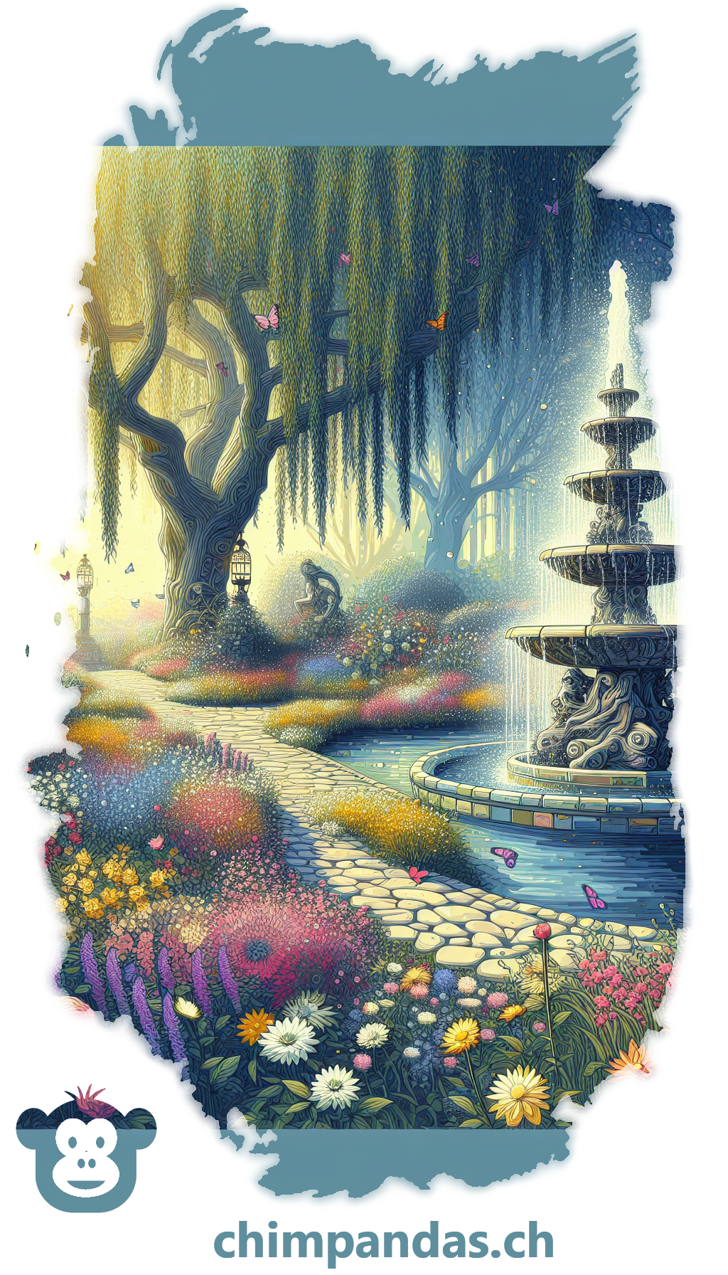 Sure, here is a prompt based on the keywords provided: Title: "Whimsical Garden" Description: Imagine a picturesque garden overflowing with vibrant colors and lush greenery. In the center of the garden, there is a whimsical fountain adorned with intricate stone carvings, spouting crystal-clear water that glitters in the sunlight. Surrounding the fountain are a variety of blooming flowers in shades of pink, purple, and yellow, their delicate petals swaying gently in the breeze. A winding stone path meanders through the garden, lined with small, ornate lanterns that softly illuminate the path as day turns to dusk. In the distance, a graceful willow tree extends its branches, providing a canopy of shade under which colorful butterflies flit and dance. Beyond the garden, a soft mist hangs in the air, giving the scene a dreamlike quality. This enchanting garden is a haven of tranquility and beauty, inviting visitors to relax, unwind, and immerse themselves in nature's splendor. Feel free to adjust or elaborate on the description as needed!