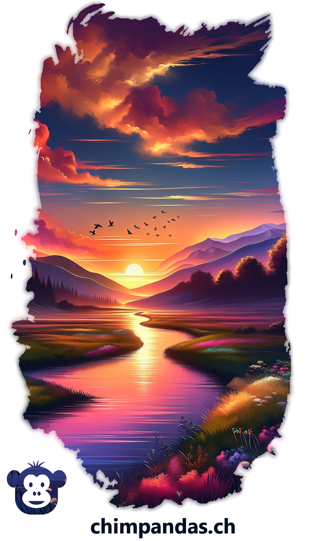 **Prompt:** Imagine a serene landscape set against a breathtaking sunset. The image features a vast expanse of rolling hills, adorned with lush greenery and colorful wildflowers. In the foreground, a crystal-clear stream meanders through the scene, reflecting the warm hues of the setting sun. The sky is painted in a palette of rich oranges, pinks, and purples, casting a soft, golden glow over the entire setting. As the sun dips below the horizon, casting long shadows and creating a tranquil ambiance, a flock of birds can be seen gracefully soaring across the sky. Their silhouettes are stark against the backdrop of the colorful sky, adding a sense of movement and life to the scene. In the distance, towering mountains loom on the horizon, their peaks capped with a dusting of snow that glows pink and gold in the fading light. Wispy clouds drift lazily across the sky, catching the last rays of sunlight and turning a warm shade of pink. As the day transitions into evening, the landscape is bathed in a soft, ethereal light that seems to imbue the scene with a sense of peace and tranquility. The stillness of the water, the gentle rustling of the leaves, and the distant calls of wildlife all combine to create a sense of harmony and serenity that envelops the entire scene. In this idyllic setting, nature's beauty is on full display, inviting the viewer to pause, to breathe, and to appreciate the simple wonders of the world around them. There is a sense of timelessness and eternity in this moment, as if the beauty of the landscape will endure long after the sun has set and darkness has descended.